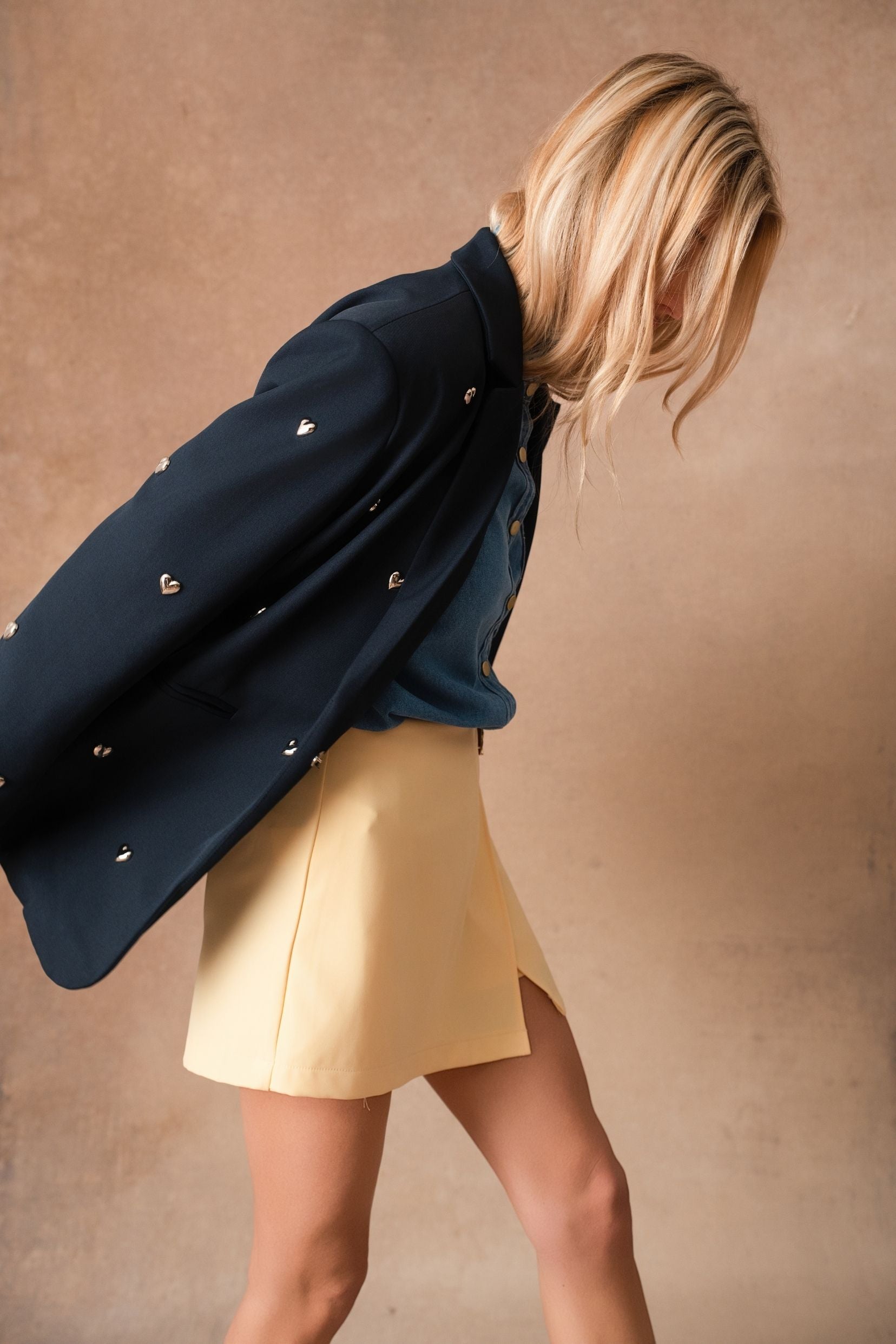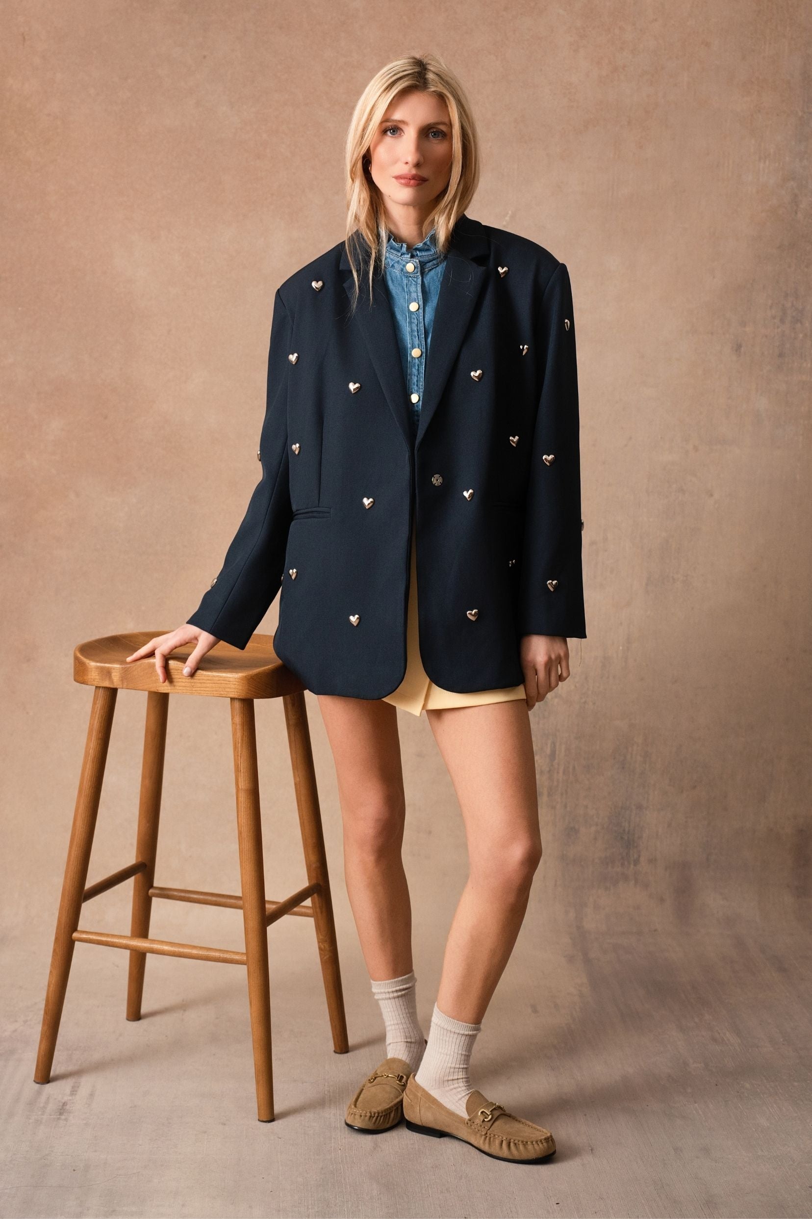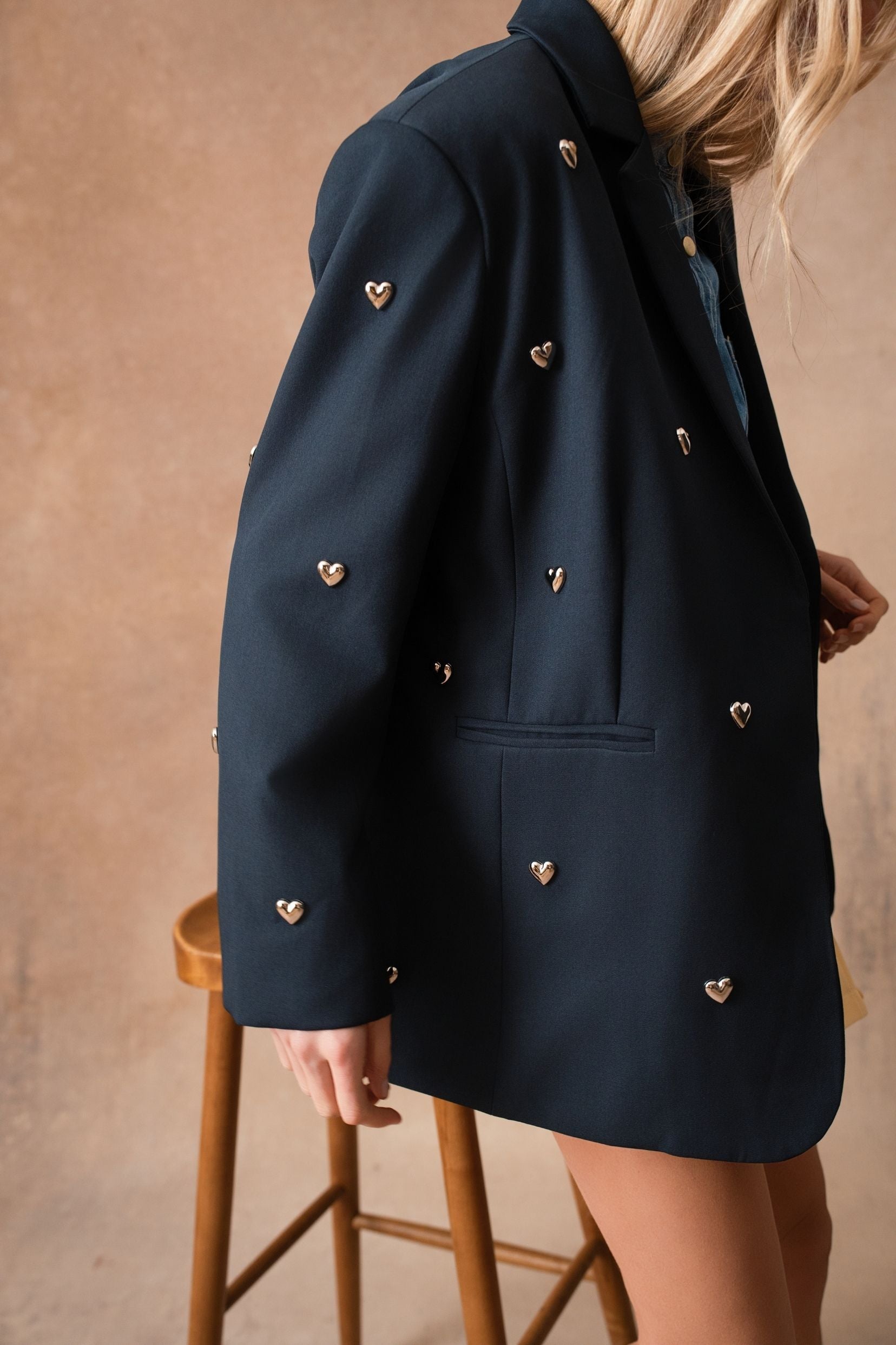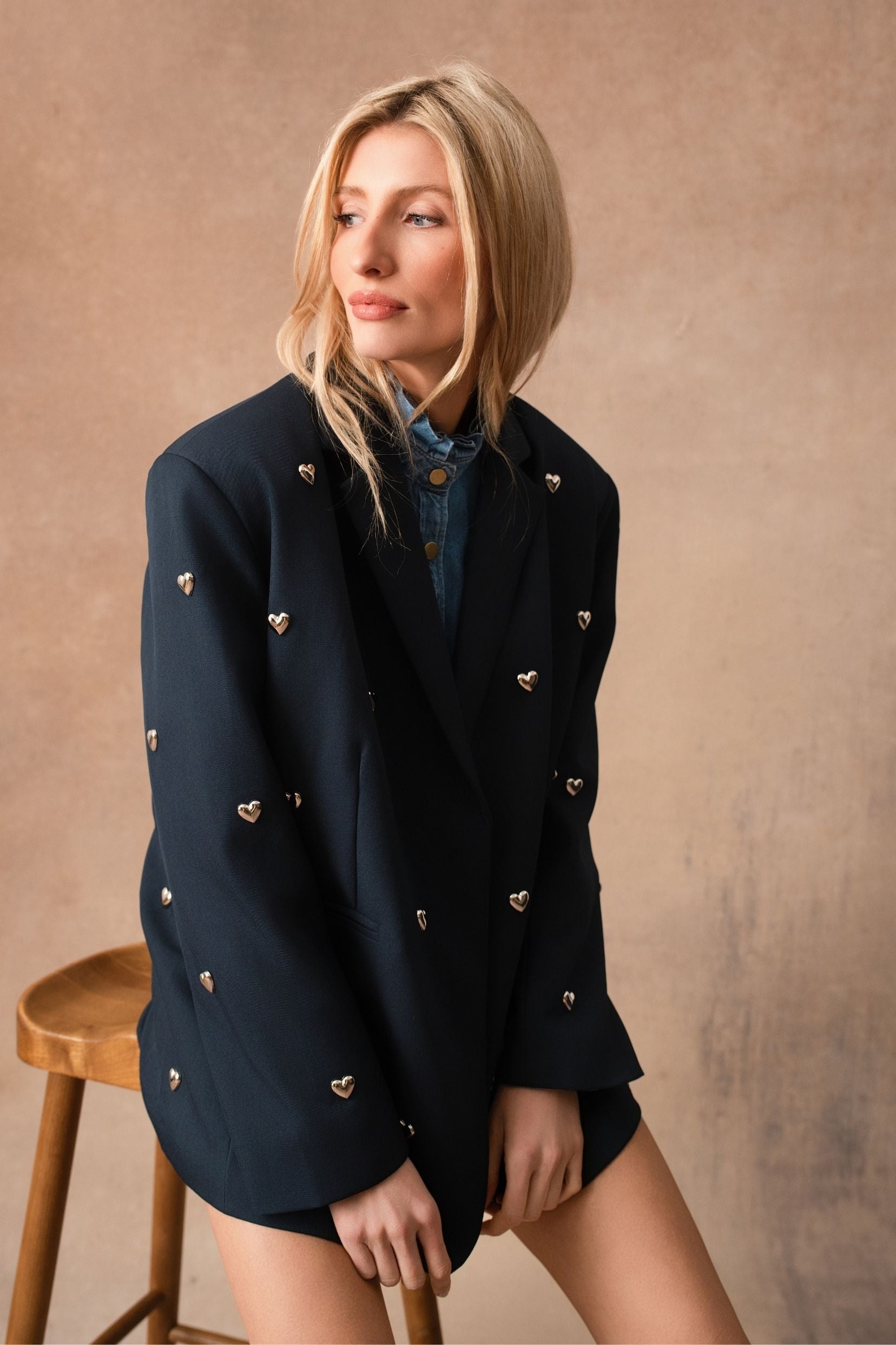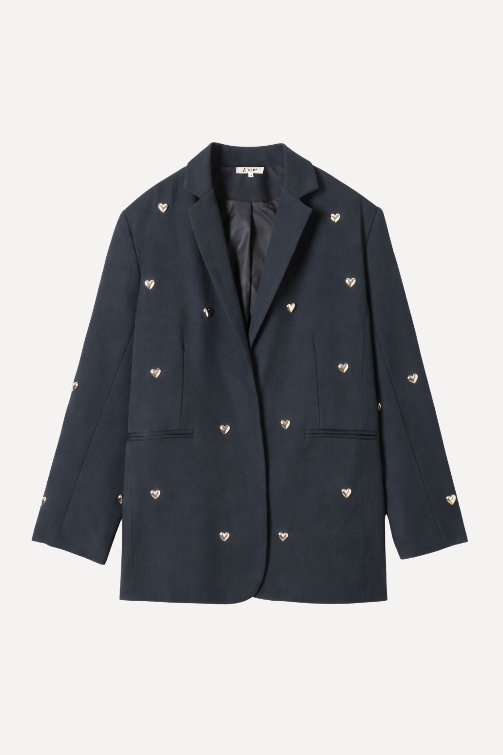 Perrine, c’est la veste de costume qui change tout. Une coupe classique, chic et parfaitement maîtrisée… enrichie de petits cœurs métalliques qui viennent poser une note espiègle et féminine. Un twist subtil qui transforme une pièce intemporelle en véritable signature Kilky Paris : audacieuse, douce, un brin romantique.