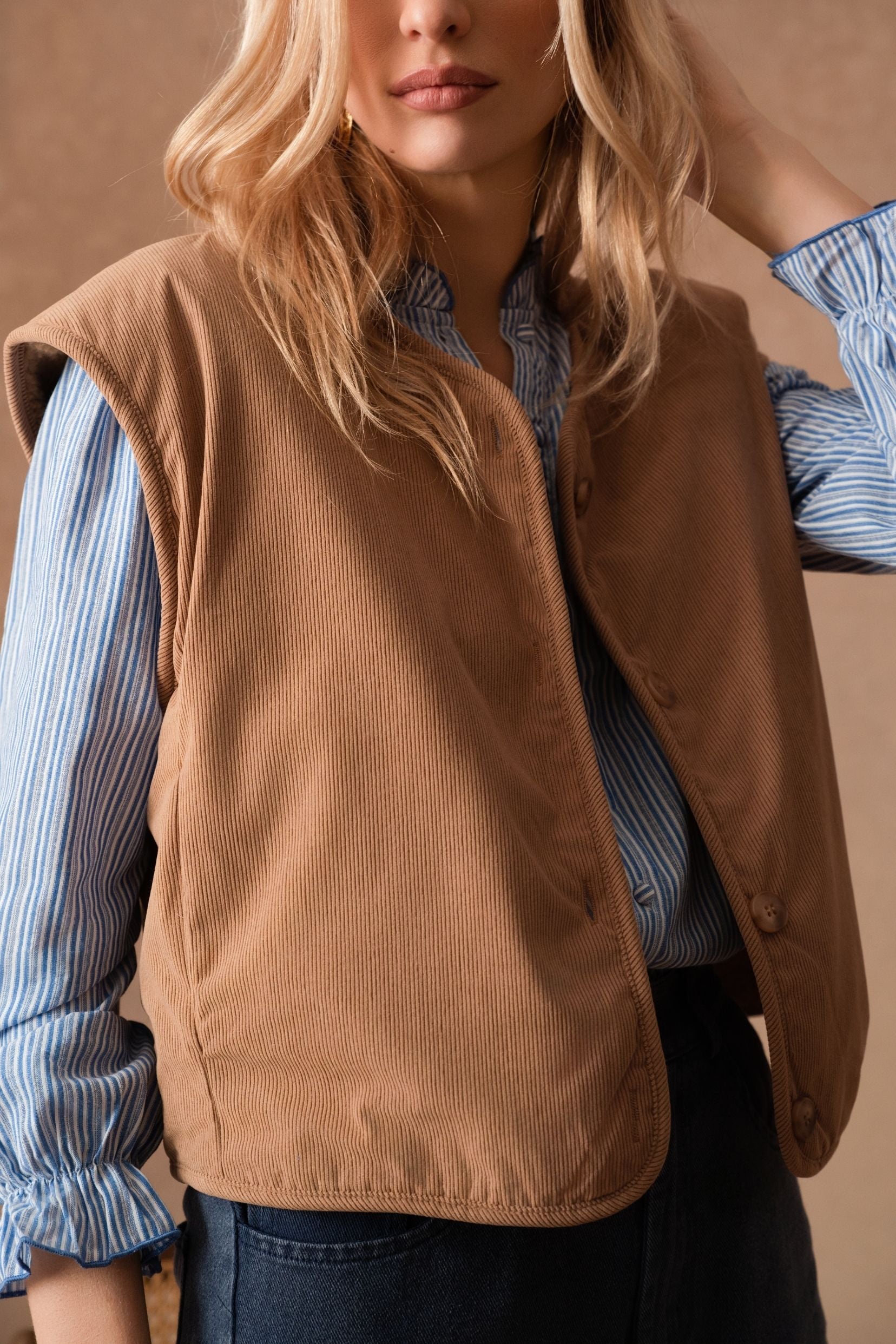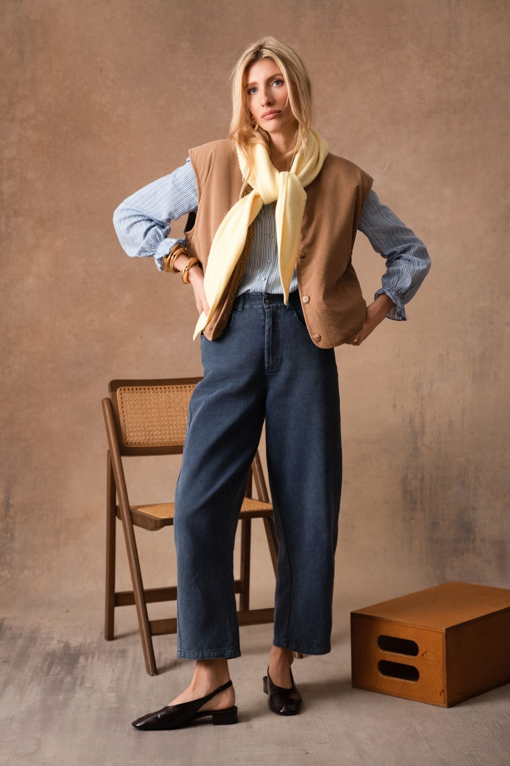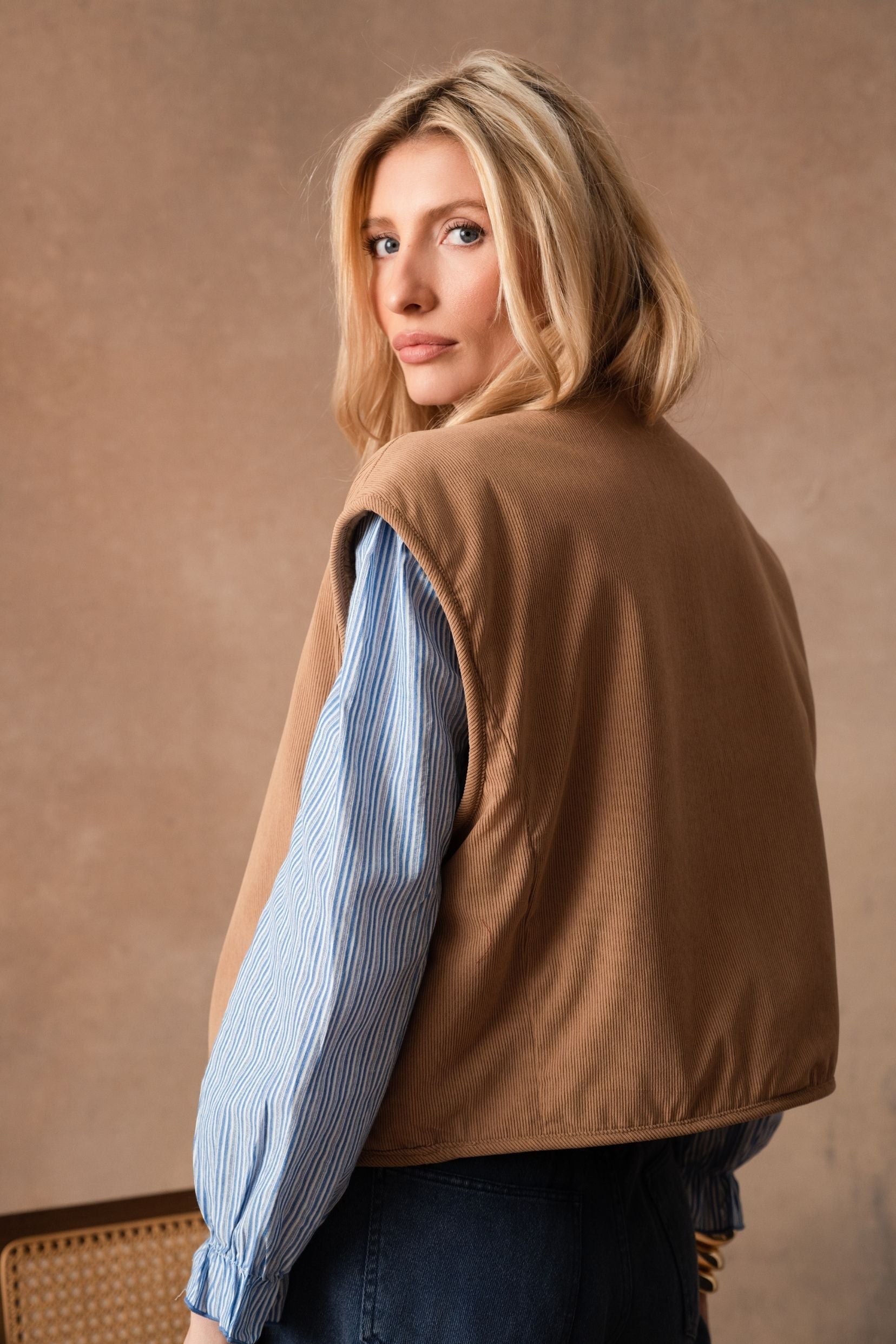 Pensée comme une pièce de transition, elle se glisse sur une blouse, un pull fin, une chemise ou même une robe, et structure la silhouette en un seul geste. Une pièce facile à vivre, à superposer et à aimer longtemps, idéale pour accompagner les saisons qui changent avec style et douceur.