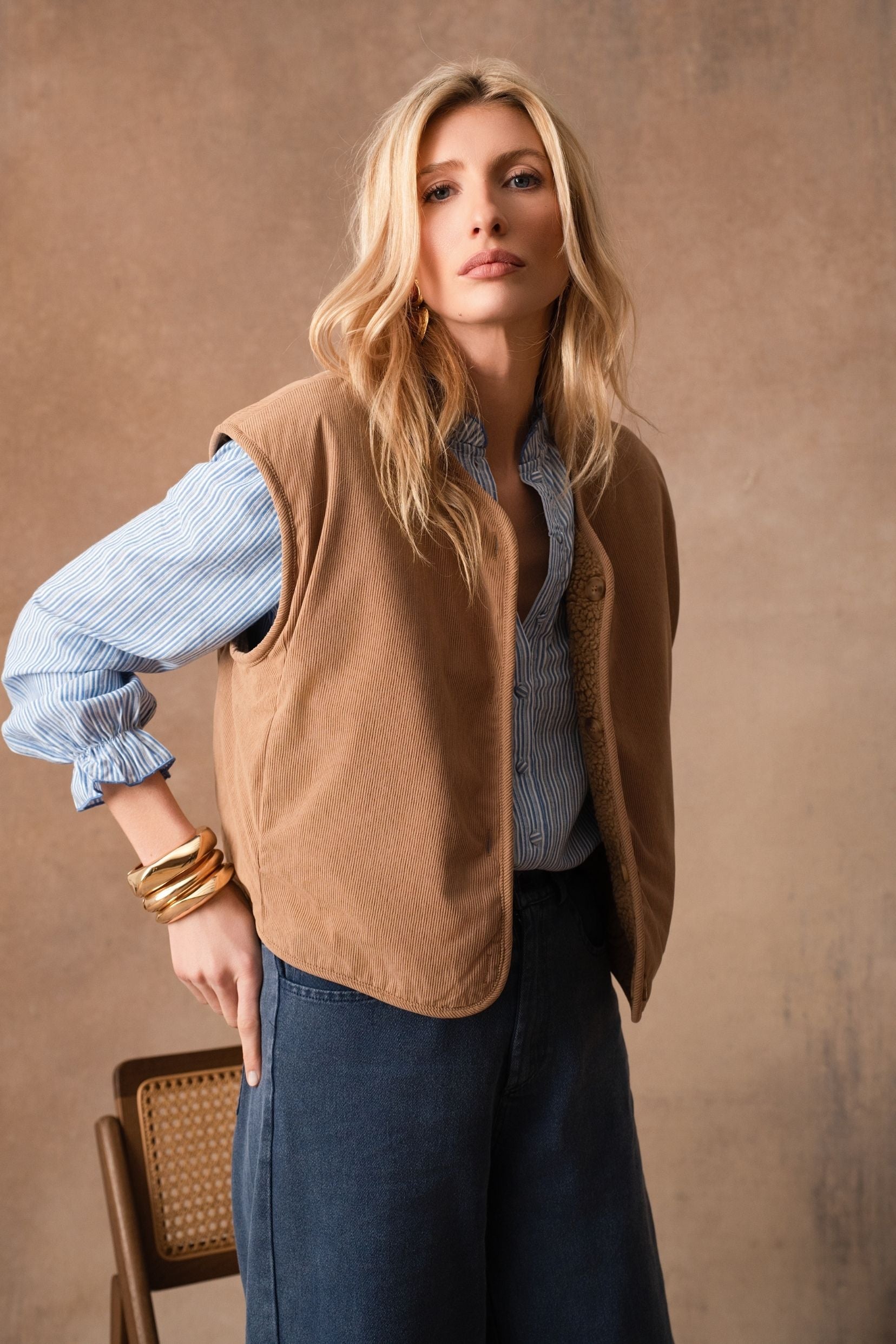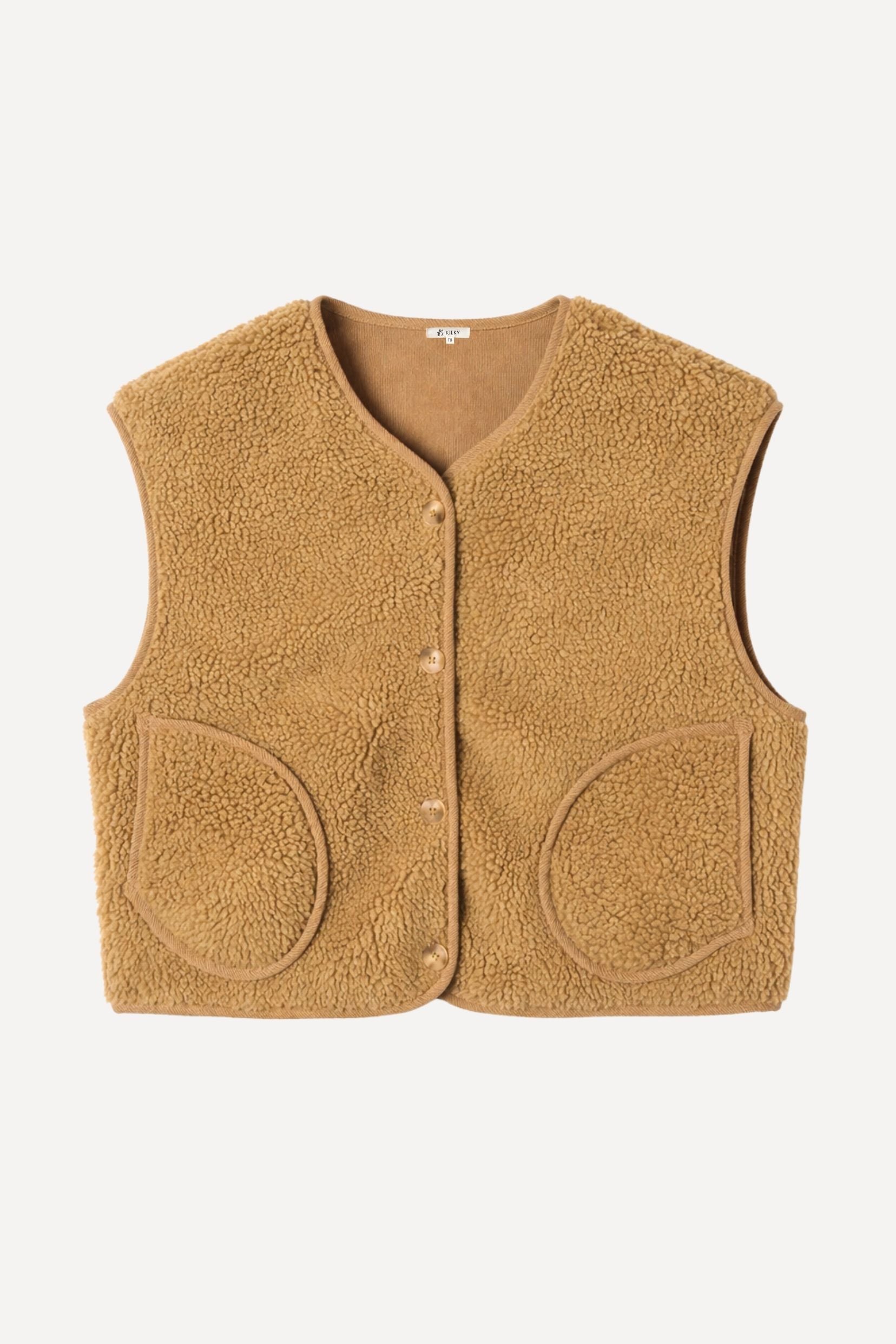 Véritable coup de cœur du vestiaire, la veste sans manches Berthe réversible apporte juste ce qu’il faut de chaleur et de caractère à la silhouette. Son coloris camel, lumineux et intemporel, traverse les saisons avec élégance. Confectionnée dans une moumoute ultra douce, elle enveloppe avec légèreté et réchauffe sans jamais alourdir.